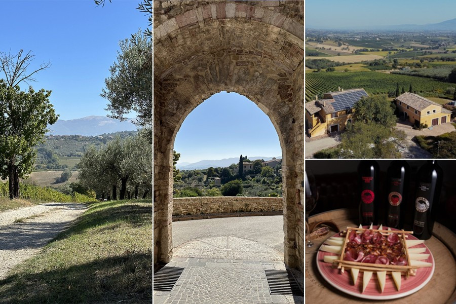Escursione tra vigneti e uliveti delle splendide campagne di Montefalco, incantevole borgo conosciuto come "ringhiera dell'Umbra", dunque luogo privilegiato per i suoi panorami sulla Valle Umbra, ma soprattutto per i suoi vitigni di Sagrantino, autoctoni proprio di Montefalco.